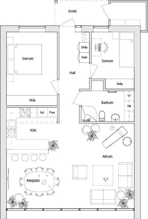 En klar och tydlig avgränsning mellan privata och sociala ytor skapar flexibilitet i användning. I alla lägenheterna möts man av ett boende som öppnar upp och bjuder in mot ljuset och utsikten. Ett stort fönsterparti släpper in ett härligt flöde av ljus och bidrar till samspelet mellan ute och inne samtidigt som det utökar boendeytan avsevärt under årets varmare dagar. Ett generöst boende som kan användas på olika sätt och av olika familjemedlemmar i takt med att familjesituationen förändras.